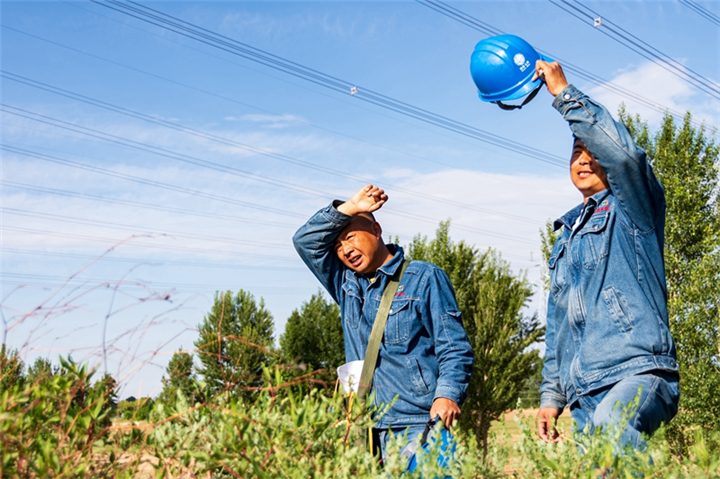 国网天津东丽供电公司员工高温天气下巡检110千伏线路。