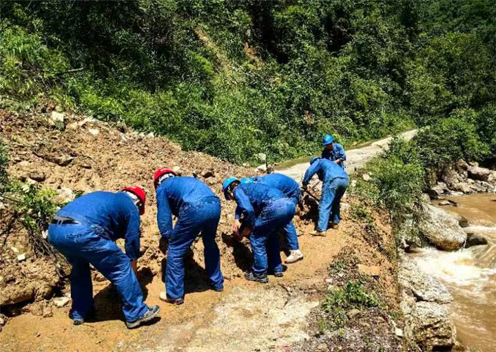 国网陕西汉中供电公司员工清理滑坡点,打通电力抢险通道。